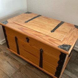 - Mörkt träade sjömanskistor med slitna kanter