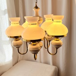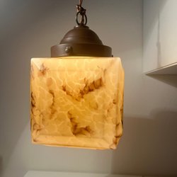 Set with 3 antique, glass bell-shaped pendulums, turn of the century, approx. 1920s. New electricity