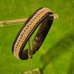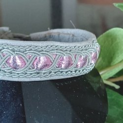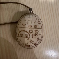 Pendant, tin embroidery, wool, reindeer skin, 40 mm diam. 52 cm leather strap. Sami, Sami handicraft