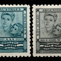 Deux timbres. "Do help Austria’s Children". Différentes langues.