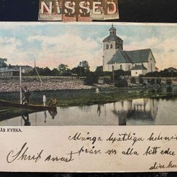 Fiskare framför Bollnäs kyrka Handkolorerat . Stämplat Jerle