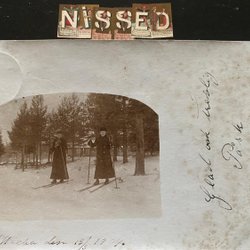 Äkta fotografivykort 2 damer på skidor vacker stämpel Vexbo 1/4 1904