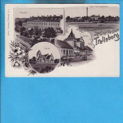 TRELLEBORG. Tecknat litografiskt flerbildskort, s.k. Gruss Aus-kort 1890-tal