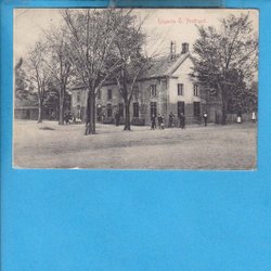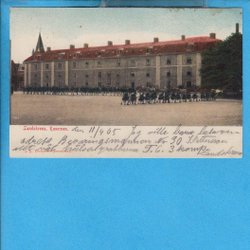 LANDSKRONA. Kasernen och militärer som laddar, i färg ca 1903