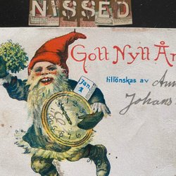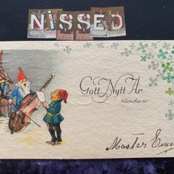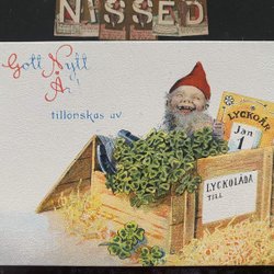 Litet vykort Osignerat Jenny Nyström Tomte i lyckolåda