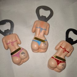 Les deux aimants bleus du réfrigérateur de grand-mère, qui sont aussi des ouvre-bouteilles. Ø: 7 cm.