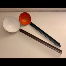 2 anciennes louches à soupe en acier émaillé. Tailles différentes. Louche, louches. Voir description