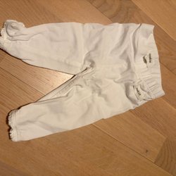 Deux paires de pantalons de bébé en bleu. Un Peanut avec des détails rouges et un de Pippi taille 68