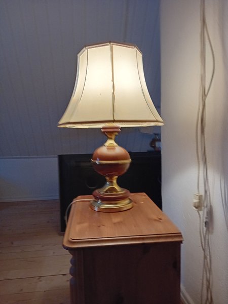En klassisk bordslampa med en brun fot och en beige lampskärm. Perfekt som stämningsbelysning.stor bordslampa nafa 140 mycket vacker