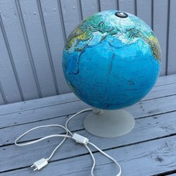 The lamp has a white shade with a gray border and a white base with a blue castle motif. The lamp is in good condition. Perfect for creating a cozy atmosphere in the home.