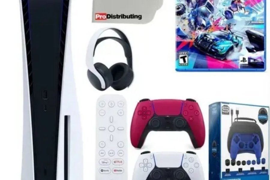 Playstation 5 med tillbehör säljes. Inkluderar två handkontroller, fjärrkontroll, headset och spelet Destruction Allstars.