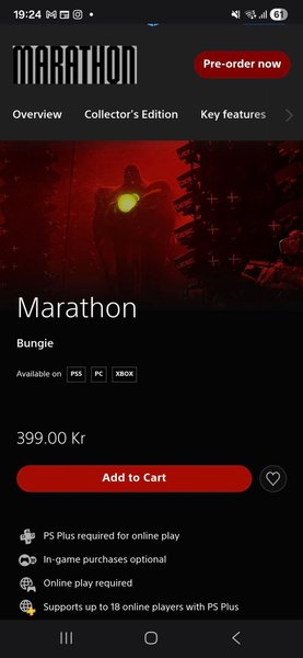 Marathon är ett spel från Bungie tillgängligt på PS5, PC och Xbox. Spelet kostar 399.00 Kr. PS Plus krävs för onlinespel. Köp i spelet är valfria. Onlinespel krävs. Stöder upp till 18 onlinespelare med PS Plus.