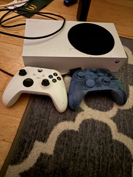 Xbox Series S med två handkontroller. Fungerar utmärkt. Den ena kontrollen fattas det dem här gummi grejerna på jojsticken. 500Gb
