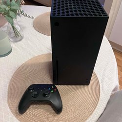 En Xbox Series X med en handkontroll och ett extra batteri. Spelet Forza följde med digitalt vid köp, tror spelet är bundet till konsolen och inte till mig.