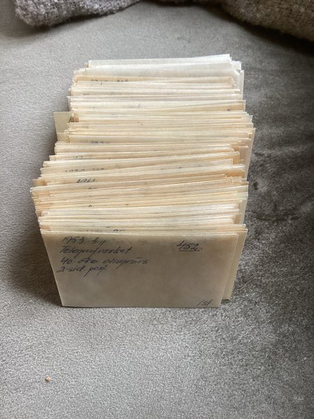 Noteringar med bläck på utsidan. Storlek ca. 6,5 x 9,5 cm. Antal, vet ej.