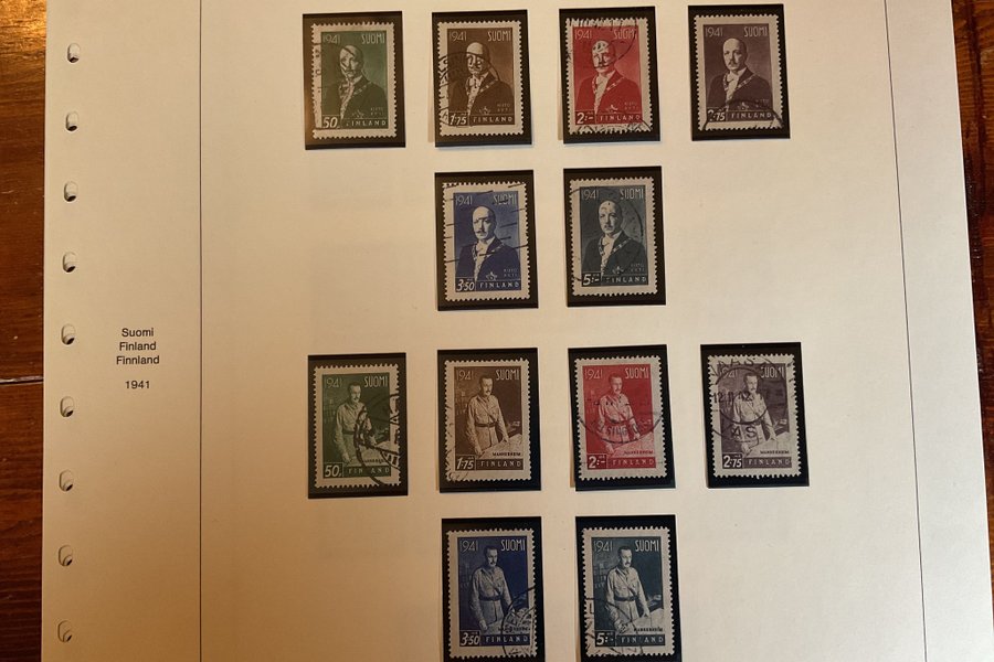 Ett blad urtaget ur album med stämplade serier/frimärken från Finland (Mannerheim & Ryti)