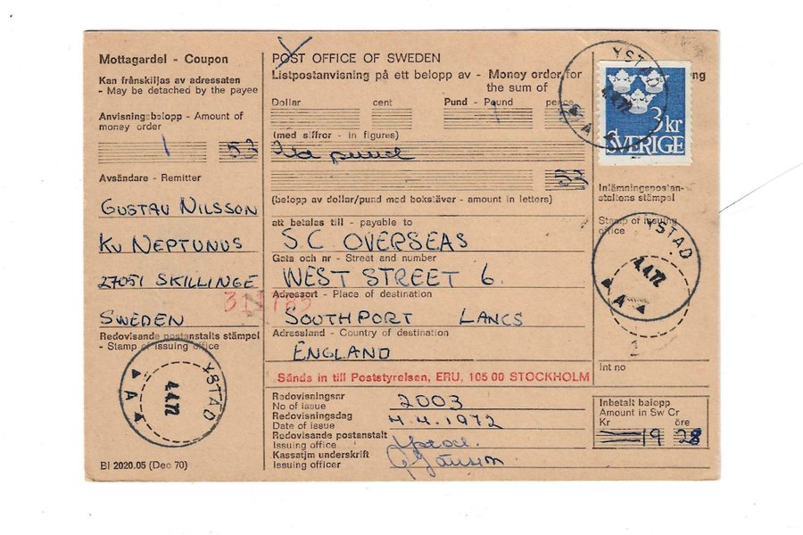 Listpostanvisning Stämplat Ystad 4/4 1972