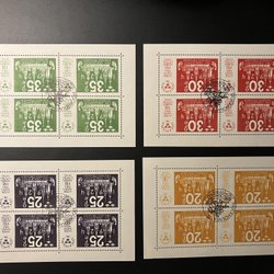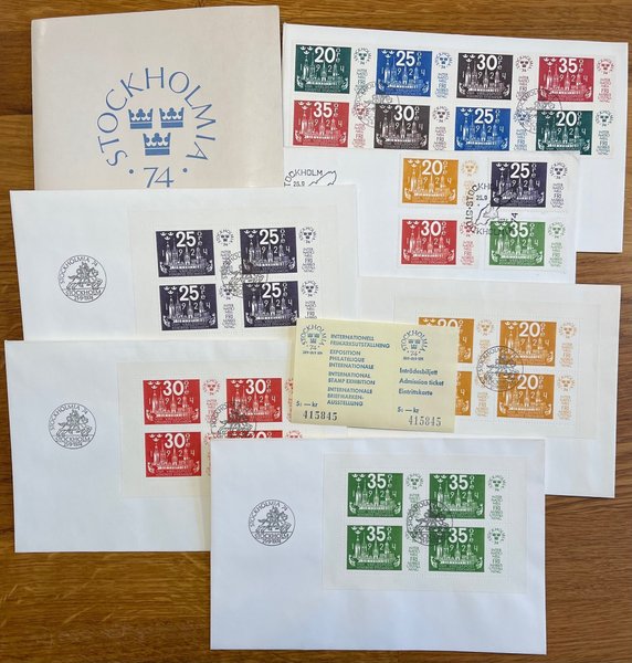 Folder med 6 st FDC samt inträdesbiljett nr 415845 till den Internationella Frimärksutställningen Stockholmia 74, 21/9-29/9 1974.