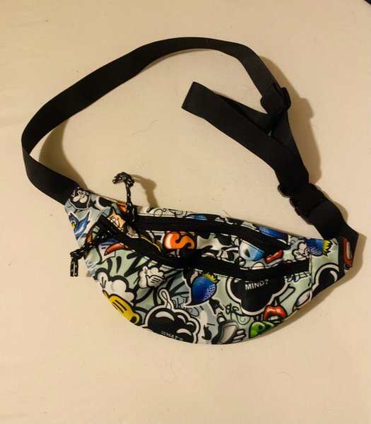Färgglad midjeväska med justerbart svart band och flera fack med dragkedja. Väskan har ett mönster med olika tecknade figurer och ord.