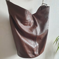 En större modell av väska som är också vändbar, två olika färger. Hållbar med träknapp. Mått är 49x40 cm. Den är av jute och bomull.