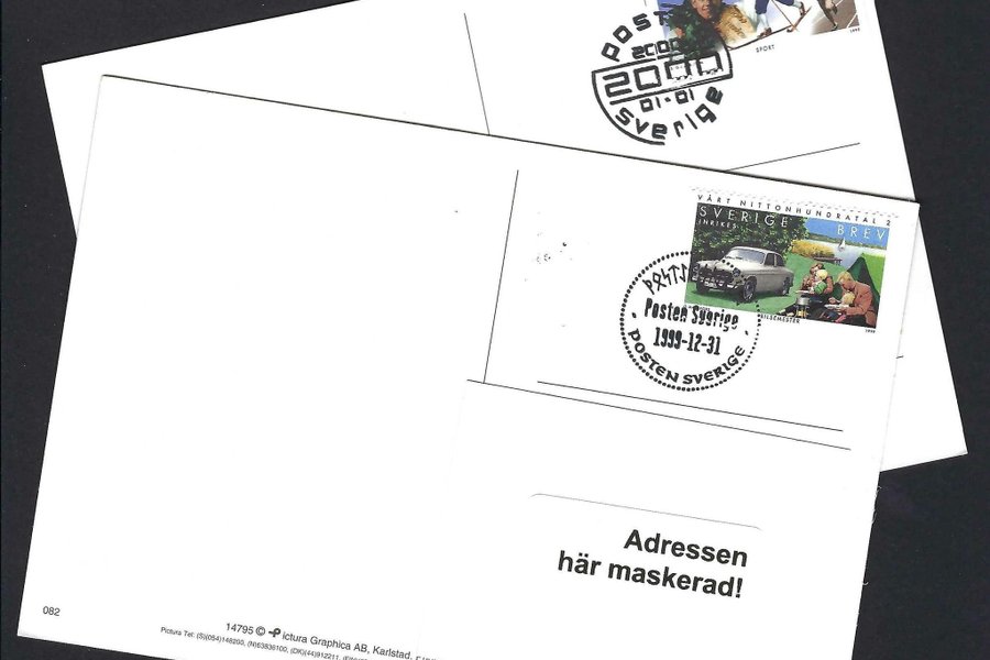 Två kort frankerade med märken ur serien "Vårt Nittonhundratal" Stämplade 31.12.1999 och 1.1.2000. Korten har skickats med post, då de har adressat angivna. Säljs i befintligt skick och skickas som vanligt brev.