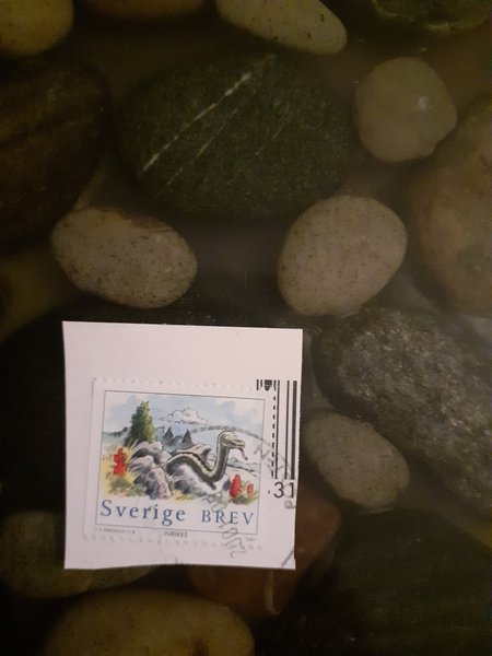 Frimärke med en orm och texten Sverige brev stämplat