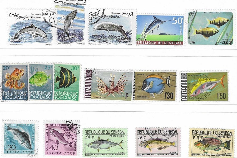Lot med märken med fiskmotiv enligt bild