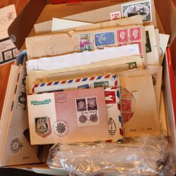 Äldre frimärkssamlingar från hela världen. Fyra album med märken monterade landvis. Bilderna visar slumpvis valda exempelsidor från de fyra albumen. Dessutom ett paket med många olika märken från hela världen, en liten låda blandade märken och en låda med märken från Spanien