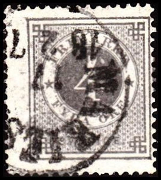 1877. Ringtype. Tk. 14. 4 øre grå