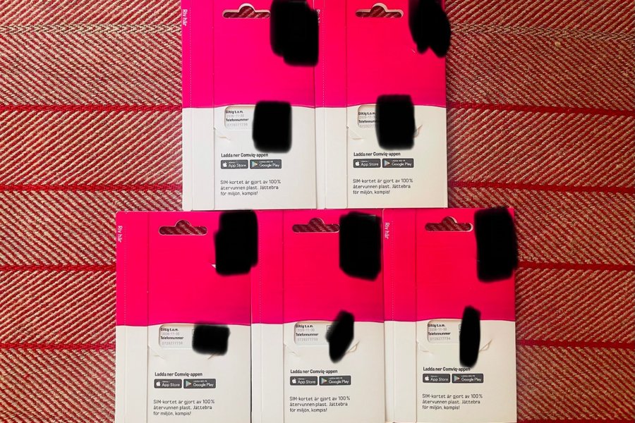 5 stycken guld Comviq SIM-kort. Giltiga till och med 2026-11-30. Telefonnummer finns på korten. Bra för företag eller hela familjen har samma telefonnummer med bara ett sista nummer differens.
