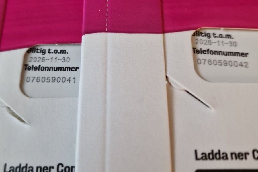 Två Comviq SIM-kort med telefonnummer 0760590041 och 0760590042. Giltiga till och med 2026-11-30. SIM-korten är tillverkade av 100% återvunnen plast. Ladda ner Comviq-appen från App Store eller Google Play.