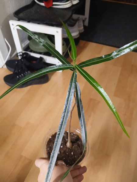 Plante i potte med karakteristiske aflange blade.