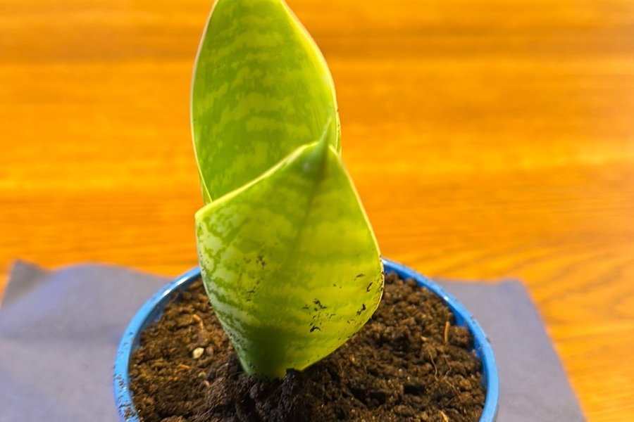 Svärmors tunga stickling grön och vit spräcklig, planterad i kruka.