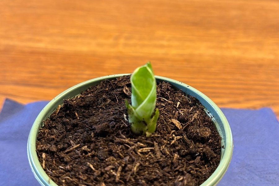 Svärmors tunga mini stickling grön och vit spräcklig, planterad i kruka.