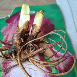 Alocasia med två blad och rötter. Växten levereras barrotad.