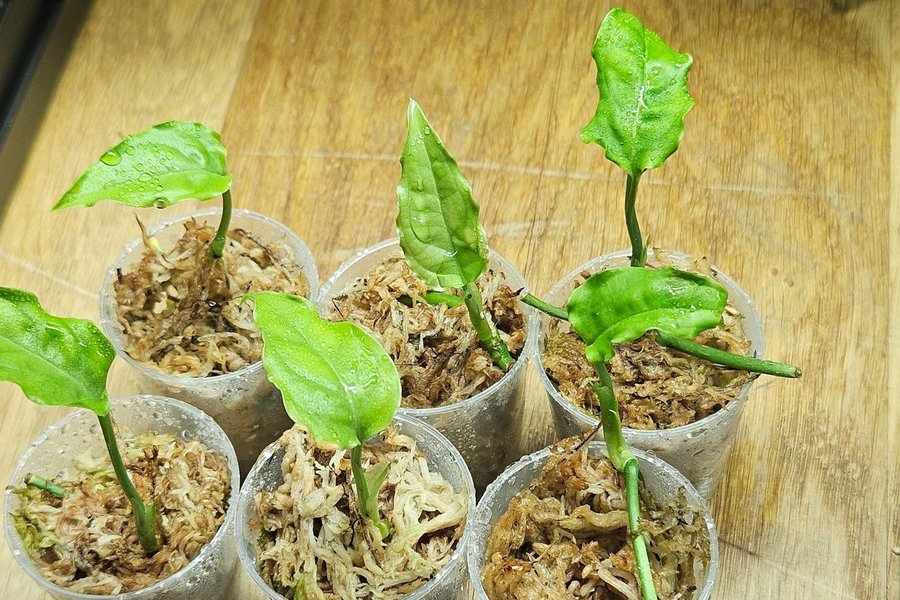 Sticklingen är rotad i mossa och fått sitt första blad.