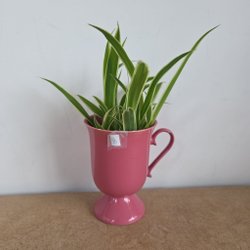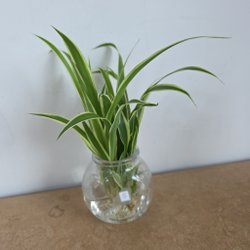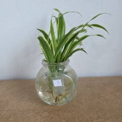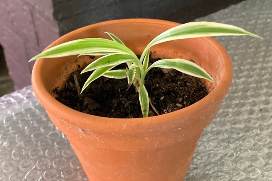 En liten rotad ,ca 5 cm hög, och planterad Ampellilja i fin terrakottakruka. Växten har grönvita blad.