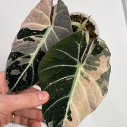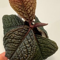 Philodendron Melanochrysum är en klättrande växt som är känd för sina mörka, sammetslena blad med kontrasterande nerver. Sticklingen stod på en för ljus plats och det uppstod svaga ränder på bladet.