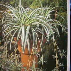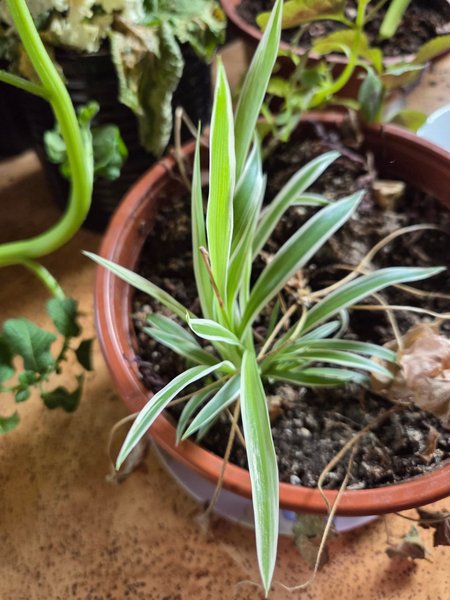 Ampellilja med grönvita blad. Planterad i en brun kruka.