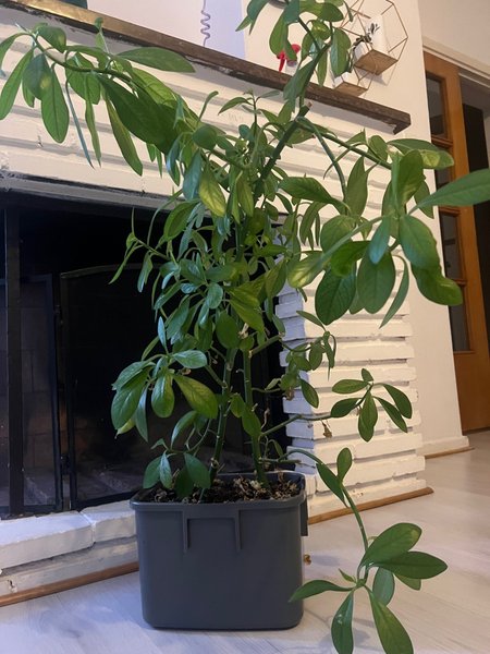 Avokadoplanta i grå plastkruka. Höjd cirka 80 cm.
