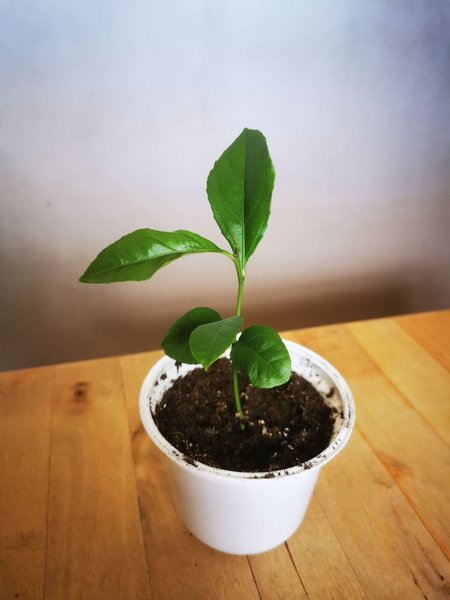 En liten citronträd planta. Plantan har flera gröna blad och redo för omplantering. Frisk och redo för en större kruka.