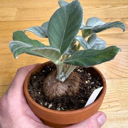 En Sinningia macrostachya, sådd från frön köpta av amerikanska Gesneriad Society. Ungefär ett år gammal, om jag minns rätt. Knölens diameter just nu 5,5 cm. Kolla gärna här med: https://gesneriads.info/genera/sinningia-macrostachya/. Notera att krukan inte ingår. Jag vågar inte garantera att stänglar och blad kommer att klara transporten eftersom de är styva och lätt bryter av, men jag ska göra mitt bästa för att skydda dem. Om de ändå skulle brytas av är det inga problem eftersom de ändå periodiskt förnyas. (Om den inte av sig själv vissnar bort brukar jag bryta av stängeln längst ner när bladen har blivit oansenliga.)
