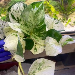 En vacker juvelorkidé i en svart plastkruka. Denna orkidé är känd för sina dekorativa blad.
