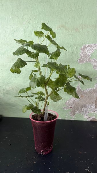 Doftpelargon av sorten Tangerine. Plantan kommer i en plastkruka.