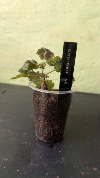 En stickling av pelargonen UNICORN - AC. Bilden visar den faktiska sticklingen som säljs. Rötter syns tydligt i den transparenta krukan.