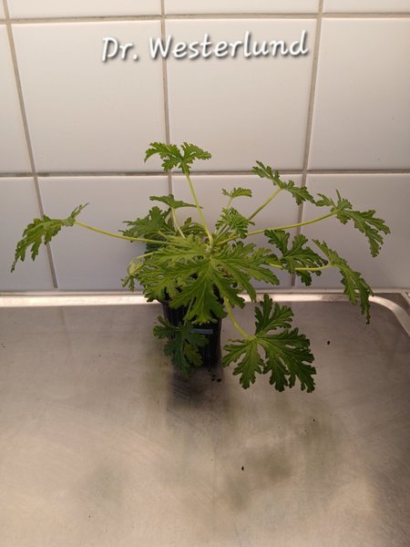 Du bjuder på en rotad stickling av doftpelargonen Dr. Westerlund. (Har tyvärr ingen bild på blommorna). Den har en härlig doft av ros och citron.