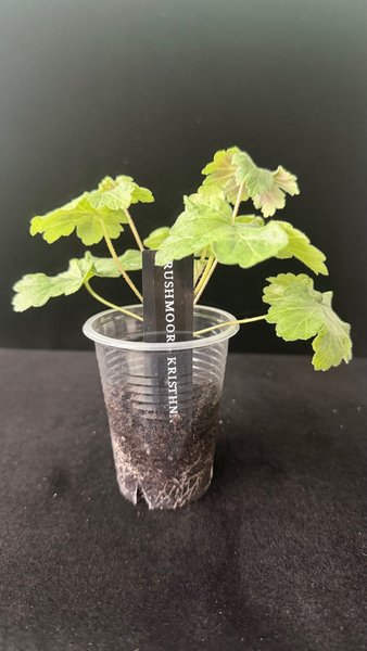 Pelargon Rushmoor Krishna är en unik sort med ljust gröna blad. Denna pelargon är redo att planteras om.