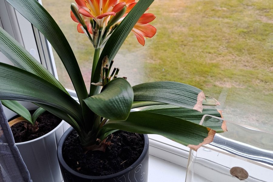 Klivia med orange blommor. Växten har långa, gröna blad och står i en svart kruka med ansiktsmönster.