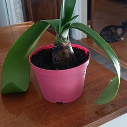 Clivia minata tålig krukväxten med långa, gröna blad och orangeröda blommor. Plantan är ca 2 år och välväxt, bladen ca 35 cm bild 3 är mammaplantan.