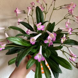 Dvärg pelargon med enkla ljusa laxrosa blommor, mörka mörka blad som nästan är svarta. Min moderplanta är lite vinterblek. Men mörknar med mera ljus.